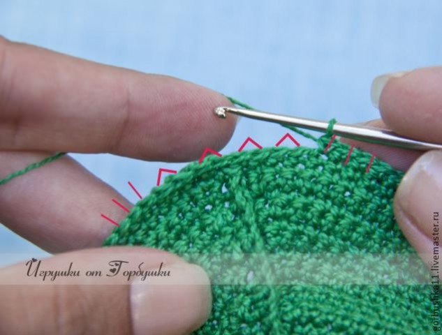 Делаем такую примерку с помощью ниточки (половина окружности шарика), и продолжаем вязать с прибавками в начале и конце каждого ряда.