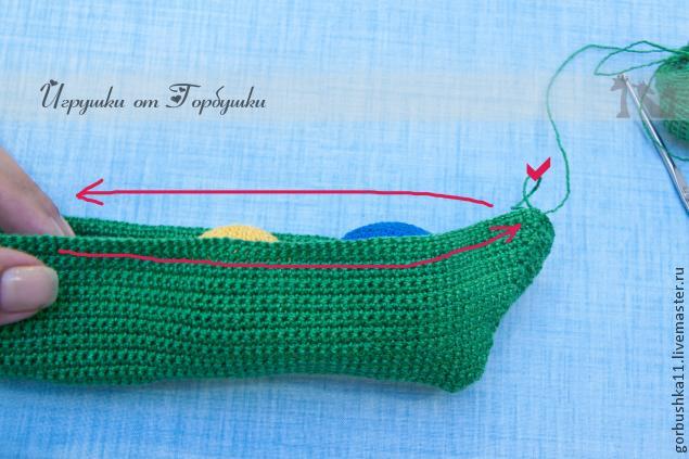 Провязываем несколько рядов с убавками и постепенно добавляем по краям синтепон.