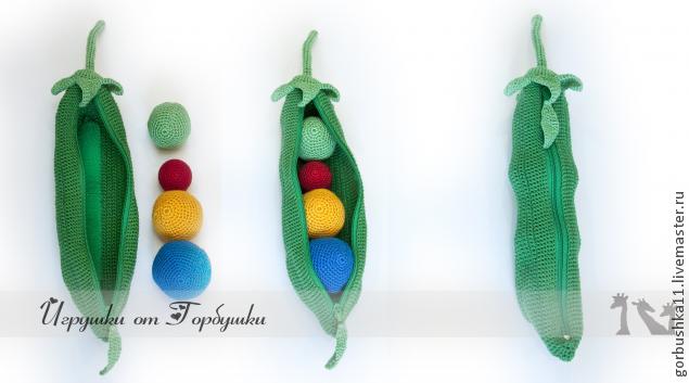 Честное слово, очень трудоёмкая в смысле мелкой моторики для самих вязальщиц игрушка.Но трудно не облюбовать такие стручки и горошины для детей.