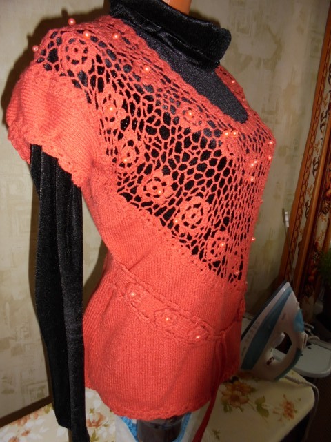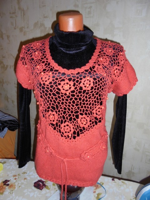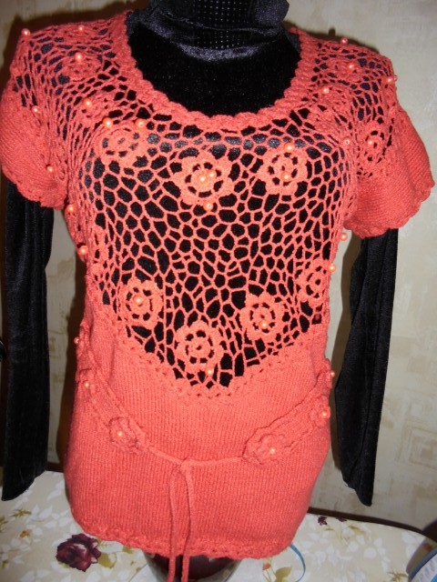 Эта туника получилась спонтанно. Была задумка связать тунику спицами чулочной вязкой с ажурным рисунком спереди. Но когда была готова спинка и половина передней, поняла, пряжи не хватит. Добавлять другую не хотелось, вот пришлось импровизировать. Связала мотивы , украсила их бусинками(в цвет пряжи) Мотивы разложила на выкройку, соединила нерегулярной сеточкой в одну ниточку. Основное полотно вязала в три ниточки. Связала тесьму для отделки( низ, горловина, контур кружева, рукава). рукава привязывала уже на собранное изделие. Низ рукавов присобрала. Получилось подобие фонарика. Декоративный поясок дополняет композицию.