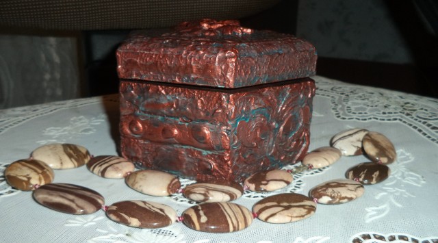 Белла, первый слой это шпаклевка и по ней сразу же прошлась пленкой, чтобы создать фактуру, после просушки, убрала " иголочки " на ней. На одной грани делала рисунок через трафарет, а на другой сама делала полоску и что то еще- одним словом полет фантазии или, что могла то и нарисовала. На крышке роза и сама нарисовала полоски и точки. За счет первого слоя с выраженной фактурой трафарет четко, как обычно, не смотрится.