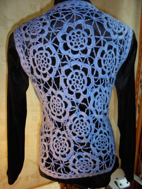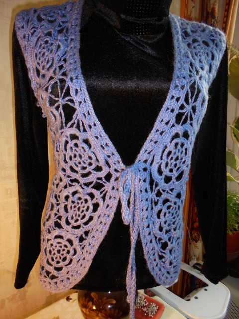 Жилет связала из пряжи дымчатого цвета 50% ангора, 50% шерсть. Мотивы соединила иглой этой же пряжей. это был мой практикум. Получится или нет. Распустить было сложно-ангора затягивает. И вот получилось как получилось. Носила его с удовольствием. Ещё и несколько заказов было. С другой пряжи, другого цвета, но фасон такой же.
