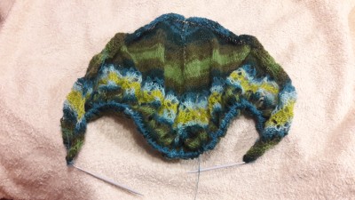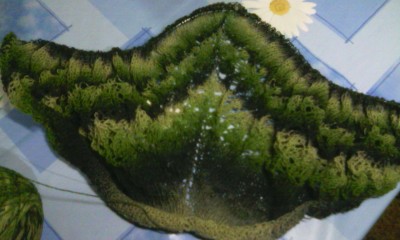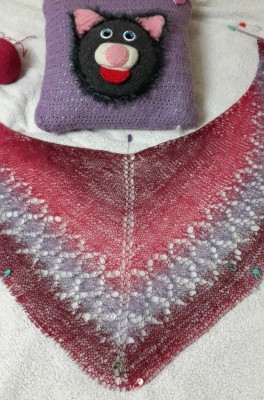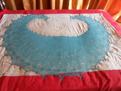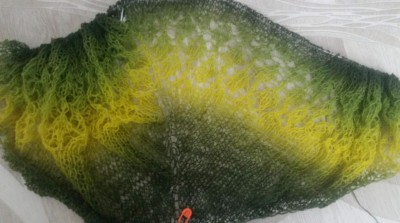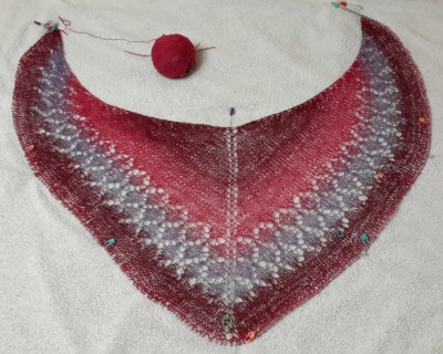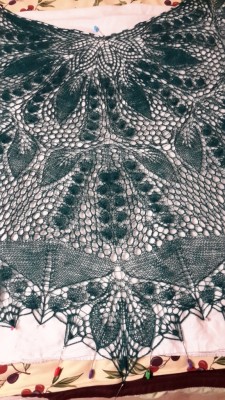Я тоже в перерыве довязала и заблокировала шаль «Альпийские луга» по совместнику Светланы в 2015 году. Досталась она мне титаническим трудом с роспуском и перевязом одной из схем. Но я довольна. Большая шалька получилась: высота 55 см, по ленточке 2 м 10 см, по внешнему краю 3 м 75 см. Рассказовская ангора, бисер чешский. Вес 110г.