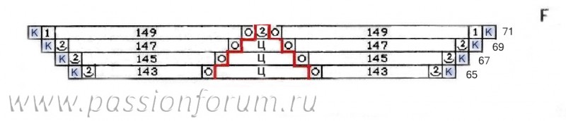 Кромочная, 1 лицевая, 149 лицевых, накид, центральная раздвоится! ( из одной две), накид, 149 лицевых, 1 лицевая, кромочная.