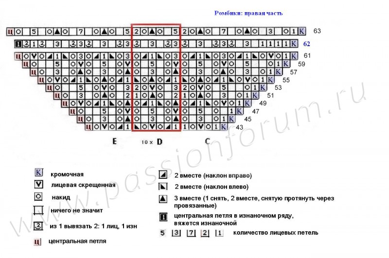 Теперь переходим к схемам "ромбики: правая часть" и "ромбики: левая часть". Тут ничего сложного нет, давайте разберём 43 ряд по петелькам, для примера. Внимание! после и до кромочной теперь мы не вяжем из 1-3. Это важно! Количество цеферок показывает сколько лицевых петель нужно провязать в этом промежутке.