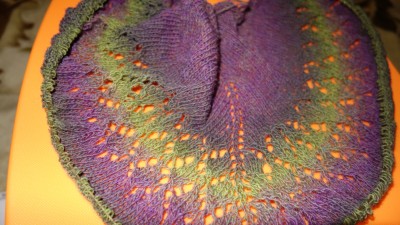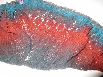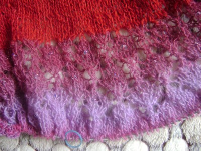 А вот Кауни соединять нужно без узелка, просто накладывая друг на дружку кончики, увлажнить немного и скрутить. После блокировки будет незаметно. Так не только в шалях, и в рукавичках, в носочках использовала. А мама у меня всё связывает самым обыкновенным узлом ))