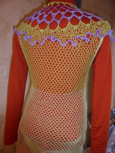 Связала шнур "гусеничка", Получился целый клубок. Вот и выложила его на выкройке., Получились не то листики, не то нераспустившиеся цветы, довязала ягодки. Соединила нерегулярной и регулярной сеточкой. Кокетку обвязала столбиками с одним накидом и бусинками. Горловина связана тесьмой -листики. Носится с маечками. Это на фото гольф одет на манекен, чтобы не скользил.