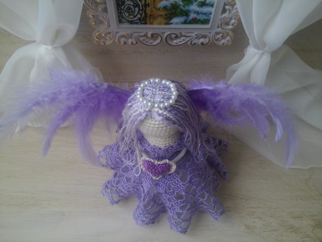 Высота ангела 18 см. Крылья на каркасе из проволоки. Крылья можно снять, а ангела постирать. Пряжа не линяет, наполнитель - холлофайбер. Цена - 20 долларов плюс пересылка.