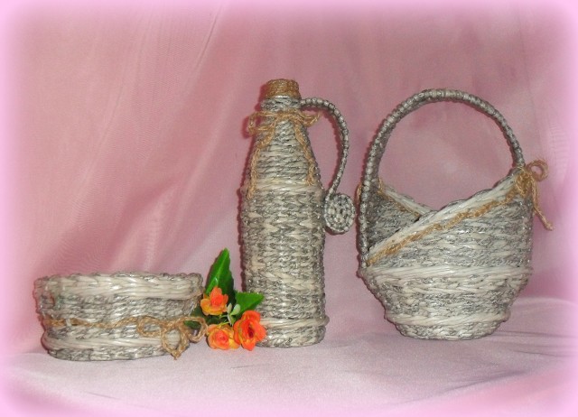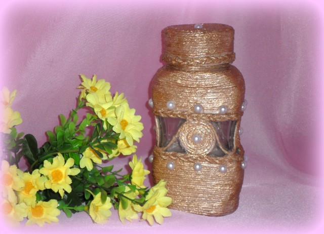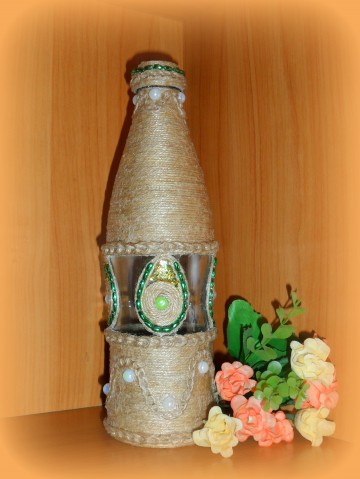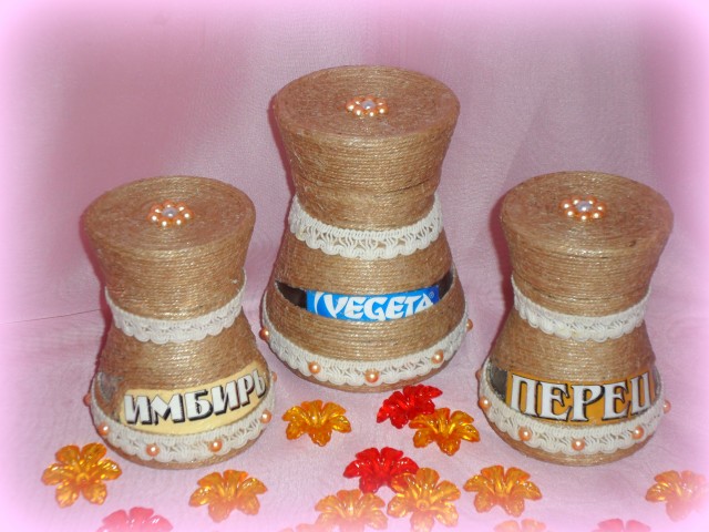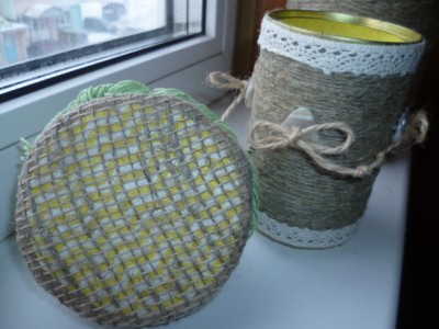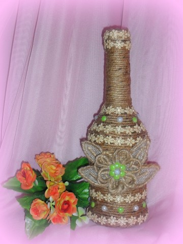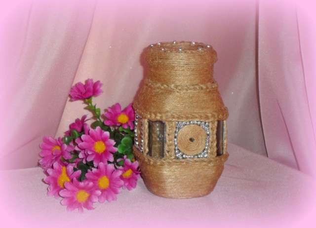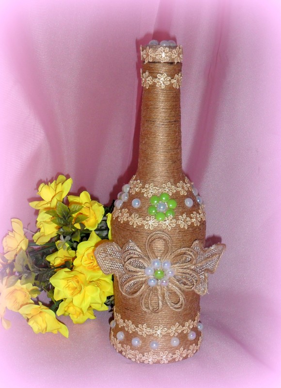 Здравствуйте,дорогие рукодельницы.Хочу показать вам то,что у меня навытворялось. Никогда не делала таких поделок,а тут вдруг захотелось попробовать.Получилось,конечно,на уровне "чайника",но мне нравится.Бутылочки подарила,а баночки у меня в хозяйстве.Вот,посмотрите.