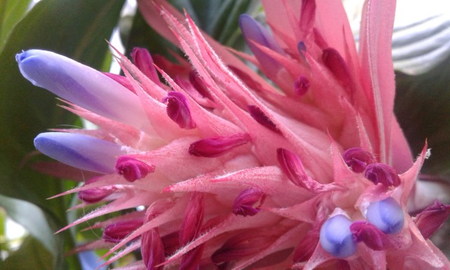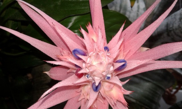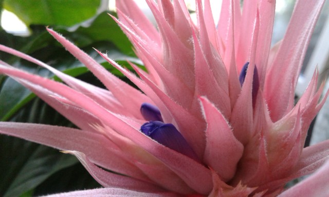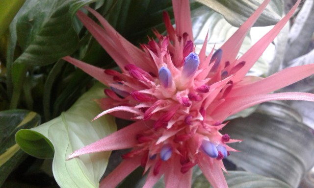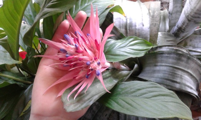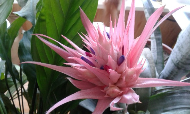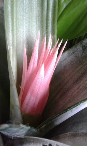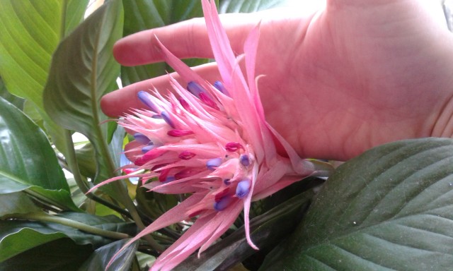 он стал расти,давать все новые и новые листочки.так он жил у меня 8 лет!никаких признаков цветка никогда не подавал..и вот в конце этого лета(2016г)..в очередной раз протирая листочки я увидела в серединке цветочек.до этого момента даже и подумать не могла,что такой куст еще и цвести умеет! ананас кстати относится к семейству бромелиевых.а теперь предлагаю вместе со мной понаблюдать за ростом,цветением и увы..неизбежным увяданием этого экзота.