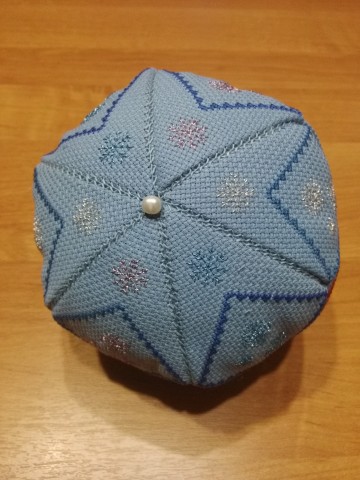 К новогодним праздникам вышила игрушку. Шар состоит из 18 деталей, в диаметре получился 46 см, набит синтепухом ( слопал не мало). Вышивала на голубой канве Аида 14.