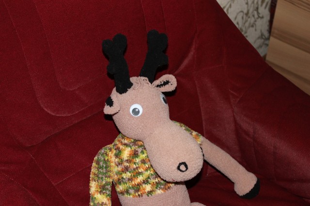Решила выставить еще одну свою работу. Сподвигла на такой подвиг меня моя дочь. Больше года она просила меня связать лося. Но я никогда не вязала игрушки и поэтом тянула время. Потом купала плюшевую ниточку, чтобы лось был приятным на ощупь. Начала вязать и поняла, что запуталась в петельках. Их совсем было не видно. Купила нитки простые и связала лосика довольно быстро. Потом исполнила свою мечту и лось второй получился уже мягким и плюшевым. Потом связался очередной лось с ногами потолще, чтобы его можно посадить на окно и он закрывал щелки. Теперь четвертый лось в подарок на день рождения моей невестке. Тоже из плюшевой пряжи. Только глаза я ему не вывязывала, а приклеила покупные. Выношу на суд мою лосиную ферму.