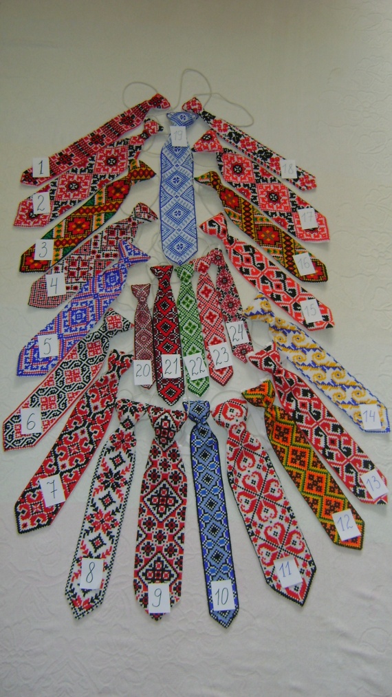 Хочу вновь показать свои работы. Возможно, кому идею подброшу. Галстуки вышиты хрестом. Хорошо ложатся под краи рубашки, поскольку имеют твердый «триугольник». Схемы я брала из старых журналов, копии имеются, если нужно — пишите.