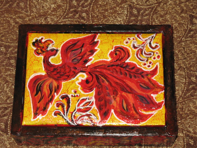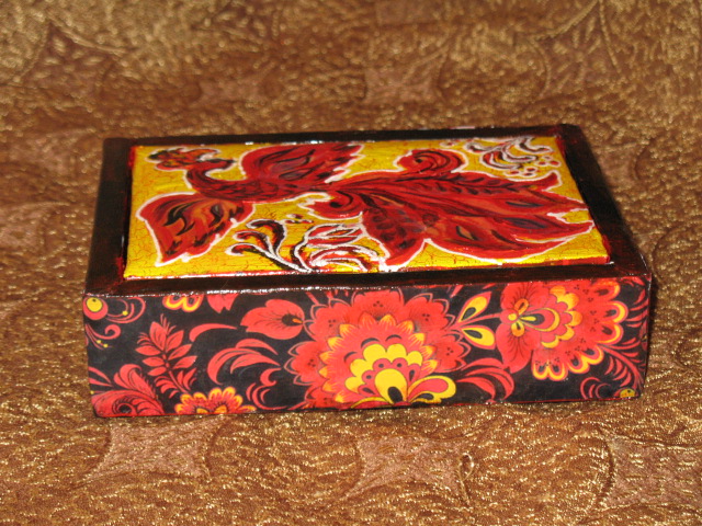 Жестяную вообще внутри не обрабатывала, т.к. там будут монетки.) А с фениксом специально сделала одинаковые бока и внуртенность. Только снаружи поярче. А внутри попритушённее краски. А вообще чаще всего хохлому делают просто ярко-красную внутри. Про другие варианты — подумаю! Но уже после Нового года! Сейчас — вал подготовкт подарков захлёстывает!))))