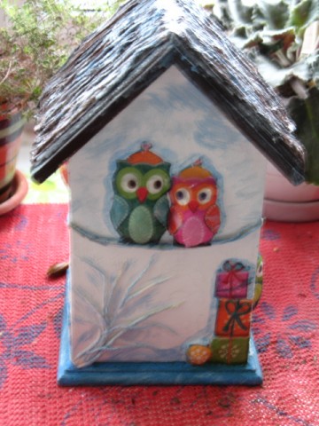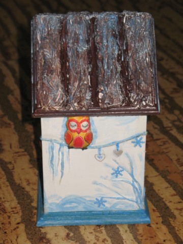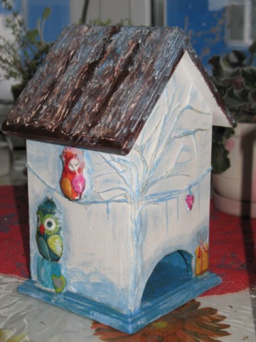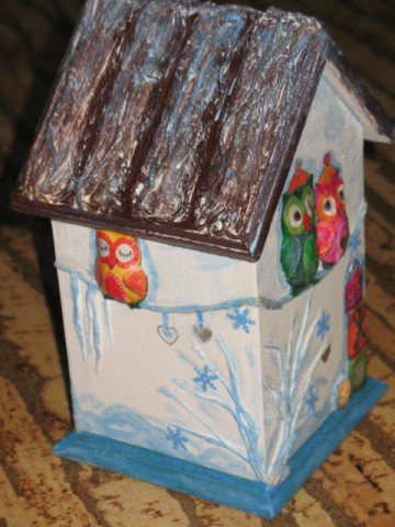 Вот такой чайный домик получился у меня. Салфетку узнает одна из форумчанок))) Мы обменивались по весне... Совушки объёмные, коробочкис подарками тоже слегка объёмные. Ветки, верёвка на которой они сидят тоже объёмные. Внутри лёгкий кракелюр, Одна стенка - декупаж, другие разрисовывала. Домик не разборный и внутри делать что-то очень сложно!))) Крыша - имитация досок с корой. Ну вроде бы всё рассказала. Получилось весёленько!)))