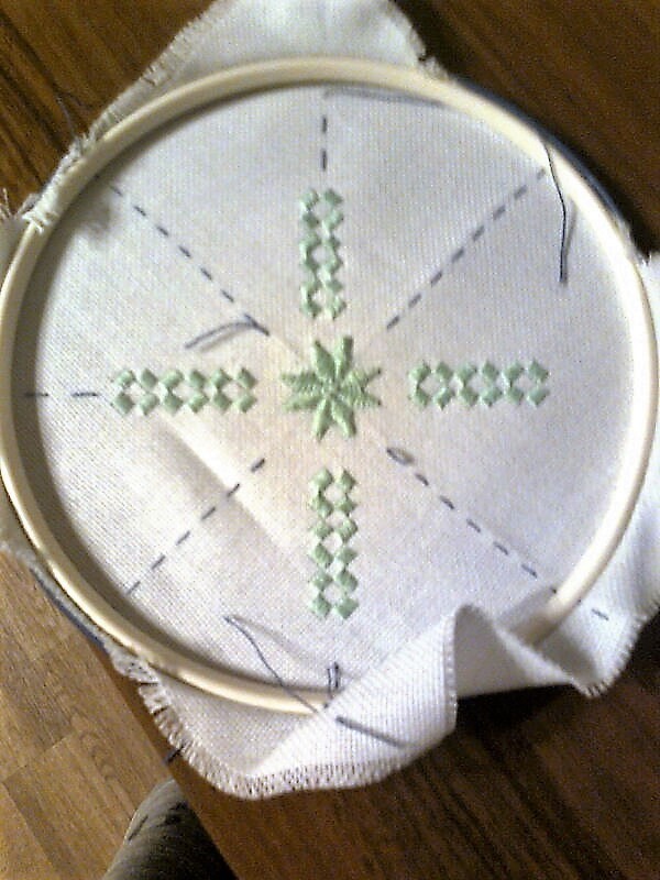 Потом я побоялась в углах вырезать нити ( ещё не освоила) и решила в четырёх уголках вышить новогодние мотивы: