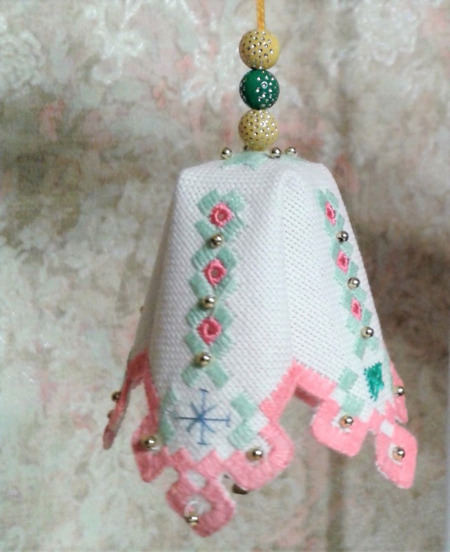 Сначала я вышивала по схеме, но так как у меня очень мелкая канва и колокольчик получался слишком маленький, мне пришлось добавить вверху ещё по одному блоку с четырёх сторон.