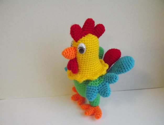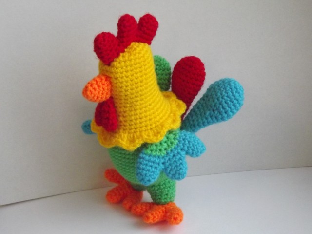 Теперь нам понадобится синтепон, чтобы набить тело амигуруми. Когда изделие наполнено, сделать в каждом ряду по шесть убавлений, пока не останется 6 петель. Оборвать нить. Тело петуха готово.