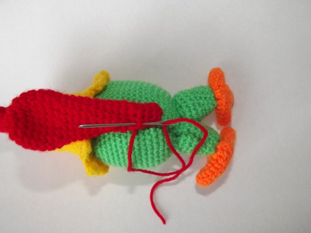 Повторяем схему вязания крыльев, то есть вяжем три детали, соединяем их ст. б/н. Далее провязываем два ряда прямо. Нить оборвать. Гребешок готов.