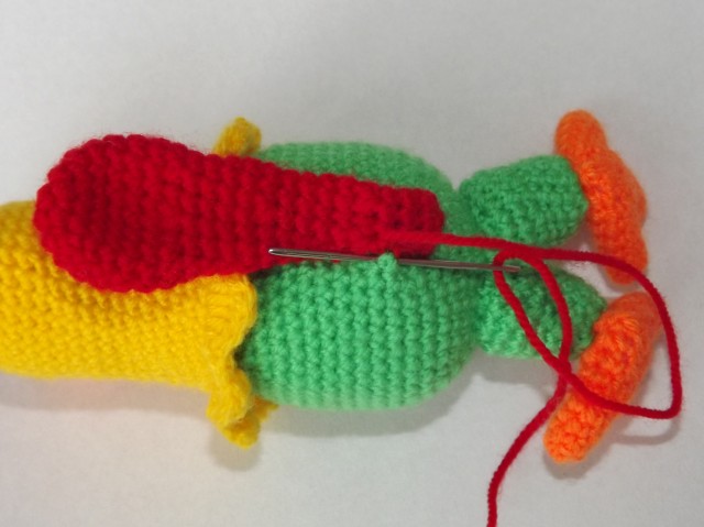 Для хвоста нам потребуются нити синего, зеленого и красного цвета. Нам нужно связать три детали разных цветов.