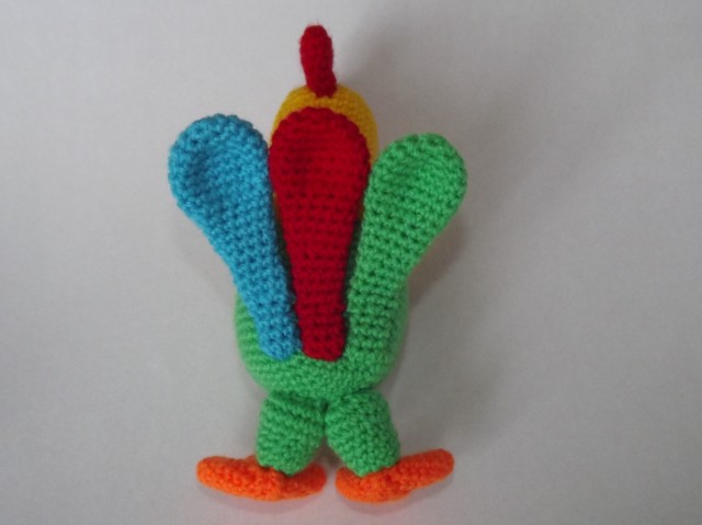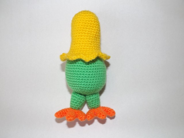 Берем оранжевую нить, делаем кольцо и ввязываем 6 ст. б/н. Далее вяжем три ряда прямо. Нить оборвать. Связать еще две такие детали. Соединить аналогично крыльям и гребешку. В каждом ряду убавить равномерно по 4 петли, пока не закроется отверстие. Нить оборвать. Связать еще одну лапу.