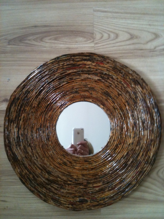 Девочки, сейчас дома ремонт.Для творчества нет ни времени, ни физической возможности.И решила я с вами поделиться своей старой работой(зимней).Это по задумке декор на стену.Два по бокам цельные, а в центре с зеркалом.Я скручивала из газет трубочки и с помощью клея ПВА, склеивала по кругу.Получились такие блины, я их покрыла бейцем для дерева и на заднюю сторону прикрутила держатели.Получилось именно то ,.что я и ожидала.Пока это ещё всё не на стене(возможно я попробую сделать сверху декупаж, не знаю).Во всяком случае, это интересная идея для основы декупажа.