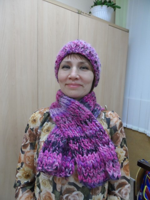 Шапка и шарф связаны самым простым узором: резинка 1-1. Сама по себе пряжа необычна. Это "Аврора" производство Турция. В мотке 150 г - 65 метров. Состав 34% шерсти, 12% альпака, остальное синтетика. Вязала на спицах № 10. Время работы 5 часов. На шапку и шарф ушло 3 мотка, но хочу довязать шарф, чтобы был более длинным, то есть 4 мотка.