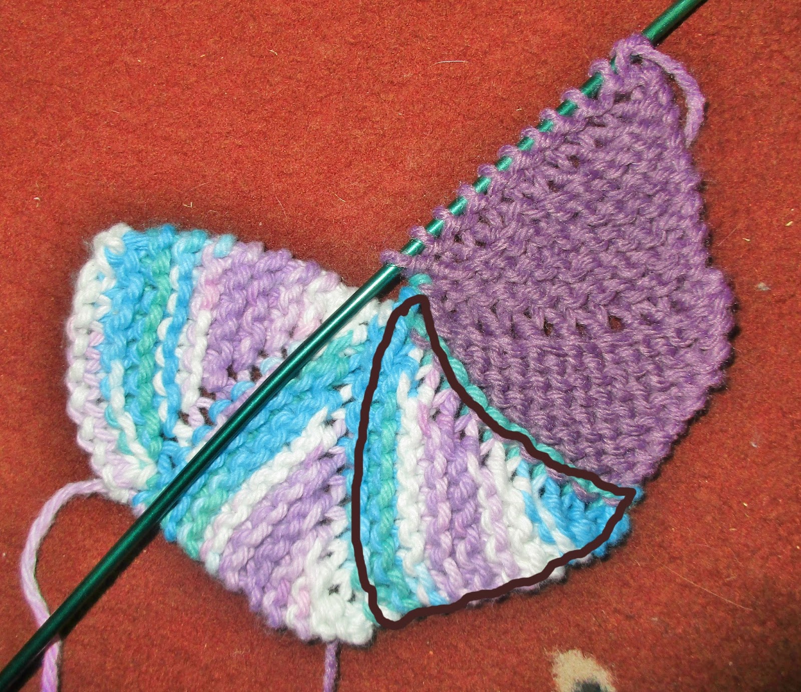 Например, набрав 10 петель надо *в первом ряду провязать 8 петель и развернуть вязание. Связать 8 петель в обратном порядке. В третьем ряду провязать 6 петель и развернуться. В пятом-4 петли и развернуться. В седьмом 2 петли связать и развернуться.