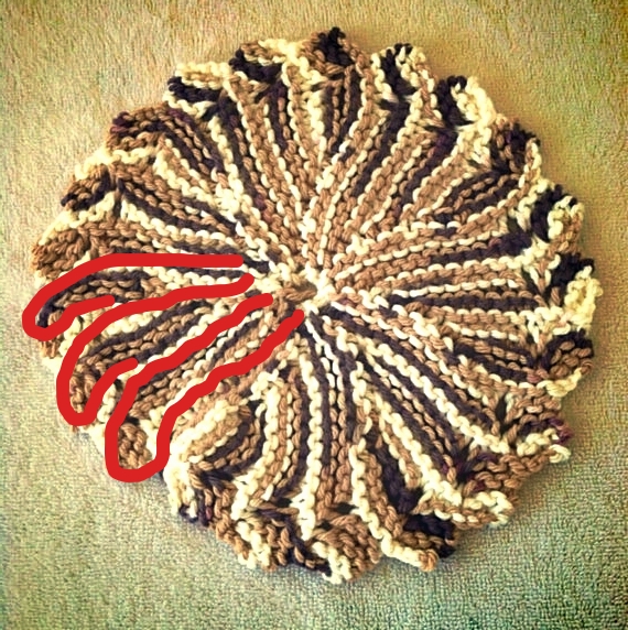 А вот если недовязывать по однoй петле в каждом нечётном ряду, то форма правильного треугольничка поменяется на изогнутую дольку, и круг будет похож на мельничное колесо.