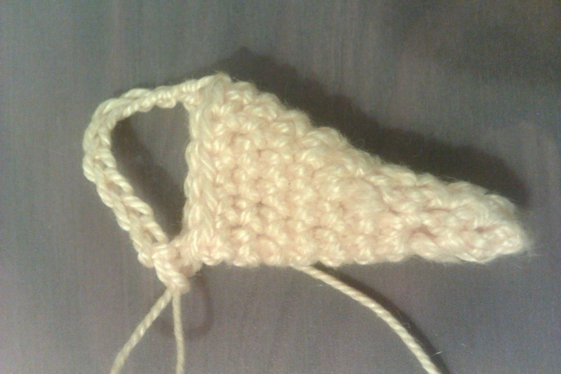 Провязать 2 ряда по 6 ст. Связать ещё 2 такие же детали, но каждая последующая короче на 1 ряд.