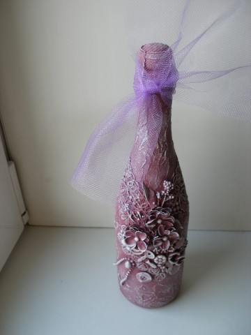 Очень красиво. Прошу обратить внимание девочек, что бутылка без фольги, что, по моему мнению, очень правильно. Когда ее все-таки решатся открыть и опустошить, это будет прекрасная вазочка для 1 цветочка. Очень понравилась идея и исполнение. Браво, мастер!