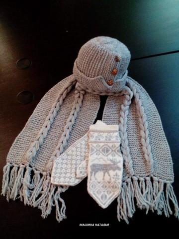Рада, что Вам, дорогие форумчанки понравился мой комплект. Но я за 10 дней отсутствие на сайте успела еще связать один коплект и тоже хочу им повастаться. от так же состоит из шапки, но на этот раз "Робин", шарфа с "объемной косой" и варежками снова связанных скандинавским узором, но на этот раз вывязывала рисунком с "оленями", палец у варежек связан "скилом", а вместо резики моя любимая "косичка-оберег". Рисунки вывязывала в зеркальном отражении, что-бы мои "олени" смотрели друг на друга, а "ягодки" связанные между "косичками-оберегами" и на больших пасльцах наклонялись в разные сроны. Хочу так же прочитать Ваши добрые отзывы, которые вдохнавляют меня на дальнейшее вязание и не тоолько...