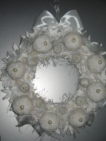 В основе веночков ивовая лоза, свеху намотана шерстяная нитка, ну и декоративные элементы приклеены. А внутри каждого веночка - салфеточка(это мне по весне присылали девочки с форума). Ну и дополнена эта гирлянда сердечками изо льна с декором.