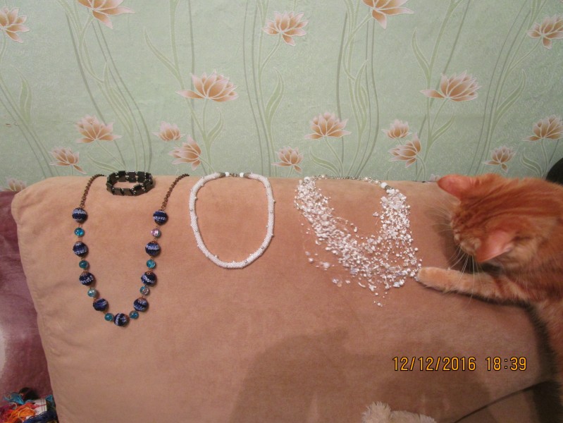А эти сокровища для меня. Браслет только для мужа. Асенька обеспокоилась здоровьем моего Витюши , т.к. он футбольный фанат, прислала для него гематитовый браслет. А на нежное колье положила глаз Алиса, пыталась стащить. Но я этот разбой пресекла.