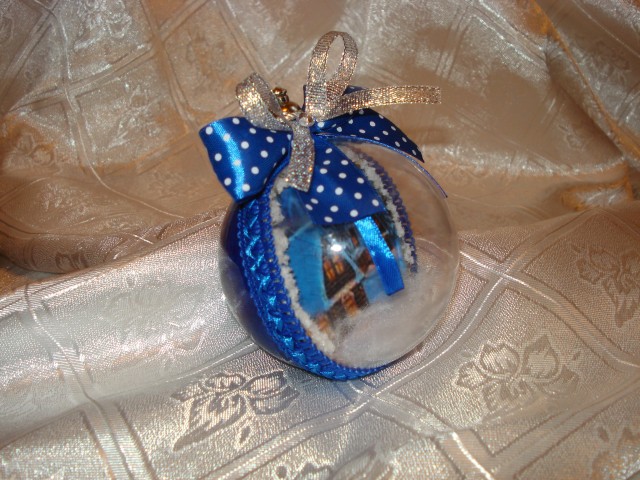 Шарики сделаны из прозрачных заготовок. одна часть окрашена полностью с бобавлением блесток. Посередине картонка с приклеенной картинкой. Добавила блесток и "снега" по краям.