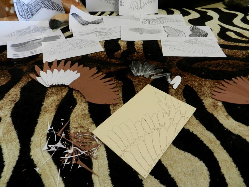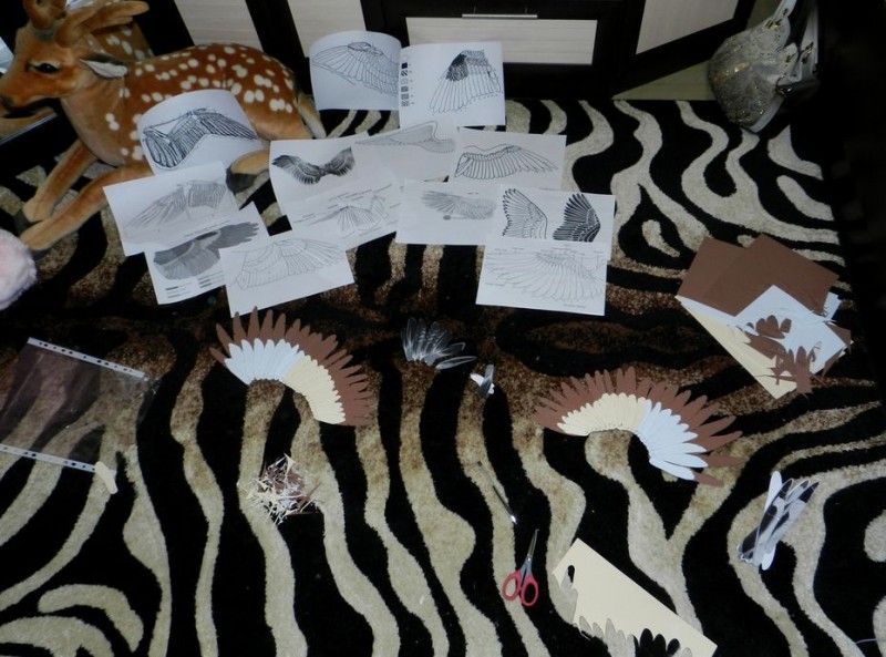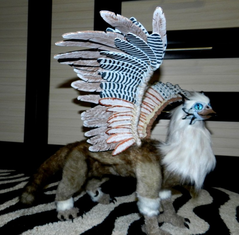 Затем перья два дня раскрашивались акрилом и сохли, потом накладывались на грифона, образуя крыло и обшивались мехом))