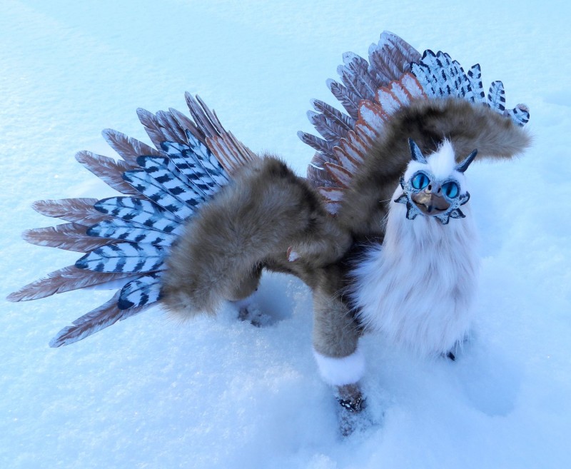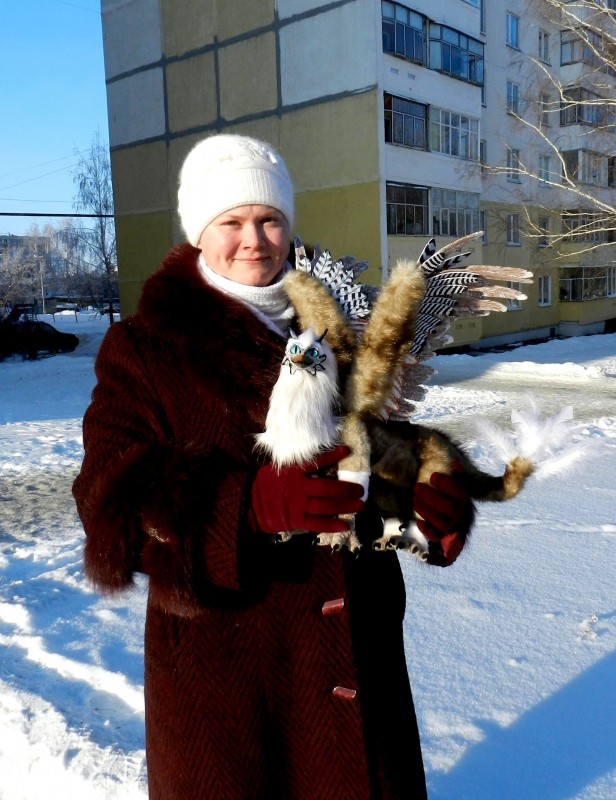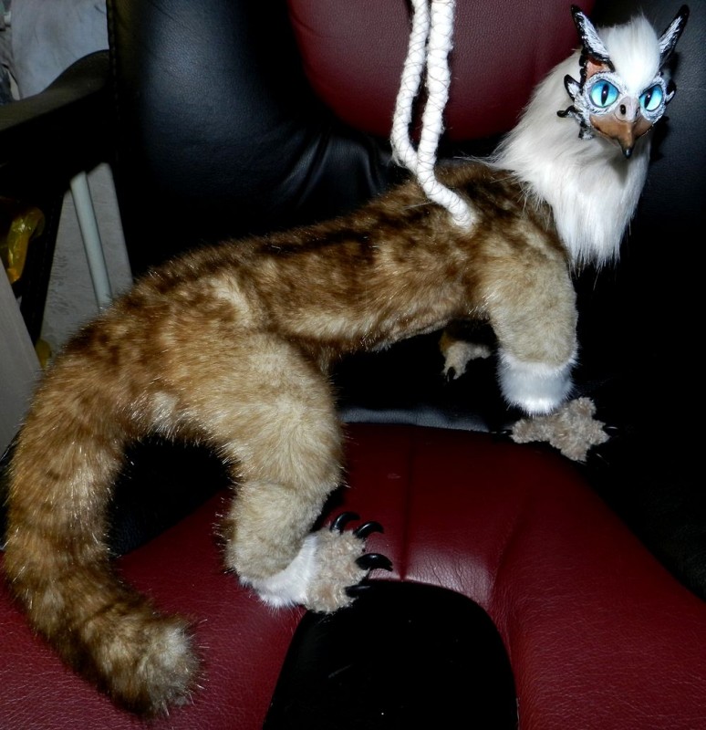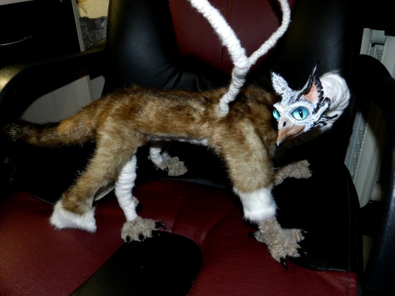 Лир,Мирэн получился большим и харизматичным. Длина грифона 73 см, размах крыльев 78 см, высота на уровне головы 30 см, высота с поднятым крылом 78 см. Крылья складываются, лапы и каждый пальчик подвижны. Изготовлен в смешанной технике за 2 недели. Материалы: проволочный каркас, наполнитель синтепон, немецкий искусственный мех - имитация норки, морда и когти из запекаемой пластики - затонировано акриловыми красками, глаза ручной работы, на конце хвоста гусиные пуховые перья. Так же использовалась пряжа Furlana, перья крыльев из иранского фоамирана - затонированы акриловыми красками и светонакопителем (пёстрые перья приглушённо светятся в темноте) Зверь является тотемным и 16 числа улетит к своему хозяину.