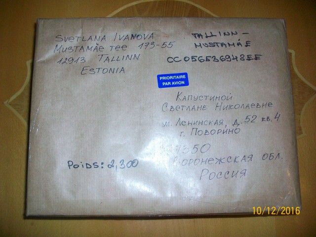 Так уж получилось, что по независящим от меня обстоятельствам (не работал интернет дома, заходила только с работы) я запаздываю с выкладкой этого топика на целую неделю. В прошлую субботу ко мне прилетела посылка от моей тёзки и Феи-Сегурочки по совместительству Светочки Ивановой (tinovna) из Таллина. Было дикое желание открыть посылку ещё на почте, но фотоотчёт - дело святое. Итак, вот она сама посылка
