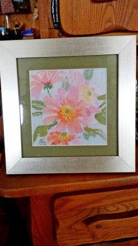 Ну и спустимся на землю. Захотела я вышить набор из трех небольших цветочно-пастельных картинок. Выбор пал наAnchor AD221 Shasta Daisies и Anchor AD221 Pink Chrysantemums. Второй вышивкой довольна полностью, а вот первое изображение меня сильно разочаровало – бледное, размытое, бесформенное. И вот на этом мой комплект из трех <<блюд>> закончился – рисковать не стала. Вышила я их летом. И лежали они у меня грузом на душе – рука не поднималась их оформить. И тут, оформляя птичек(вы их увидите в следующем топике, там для того, чтобы закончить оформление нужна гтубая мужская сила!), я все-таки взяла с собой и цветочки когда пошла выбирать <<скворечники для птичек. Ну и сложилось, скажем так неплохо. Я рада, что цветочки обрели свои домики, теперь дождаться когда появится оконченные зал с кухней и повесить их на стену. В принципе, я знаю куда я их повешу, но там пока весит новогодний венок. Mне пока не до цветов - только все убрала и украсила в доме как муж решил позаботися о хлебе насущном, внести рациональное зерно и бух-бах, нет зала - все отодвинуто, стены обшиваются деревом. Но! этоже кроме других плюсов мне на руку - в деревянную стену легче гвоздь забить. чтобы картины вешать! будем терпеливо ждать и... тихо надеяться, что на Новый год будет место и для праздничного стола, а не для досок.