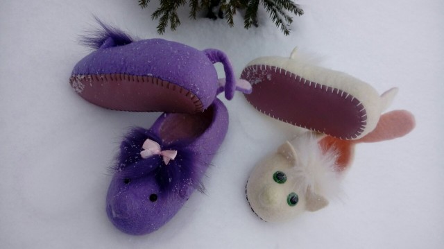 Тапотушки из шерсти, выполнены методом мокрого валяния, внутри выложены мериносовой шерсткой для чувствительных детских ножек, подшиты качественным кожзамом, который не позволяет юным шалуньям кататься по полу. По просьбе заказчиц тапотушки -зверушки украшены мехом в виде озорной челки:)