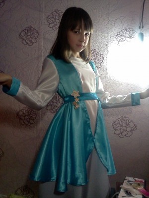 Я недавно спрашивала о платье для дочери . В общем общими усилиями мы с ней вместе таки утвердили фасон платья. Чего мне стоило его сшить - промолчу. Так как ткань скользкая и не цензурно выражаться я не умею, а цензурно это не передашь ))))