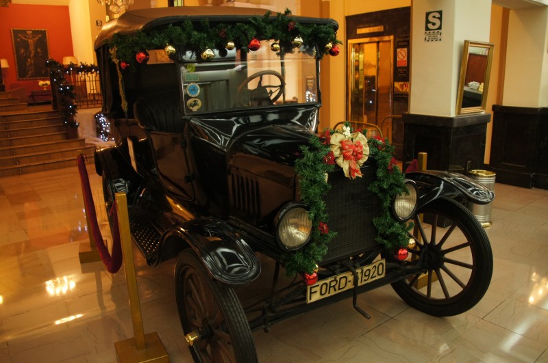 Старый форд, самый первый в линейке машин, на деревянных осях стоит в отеле, в холле.