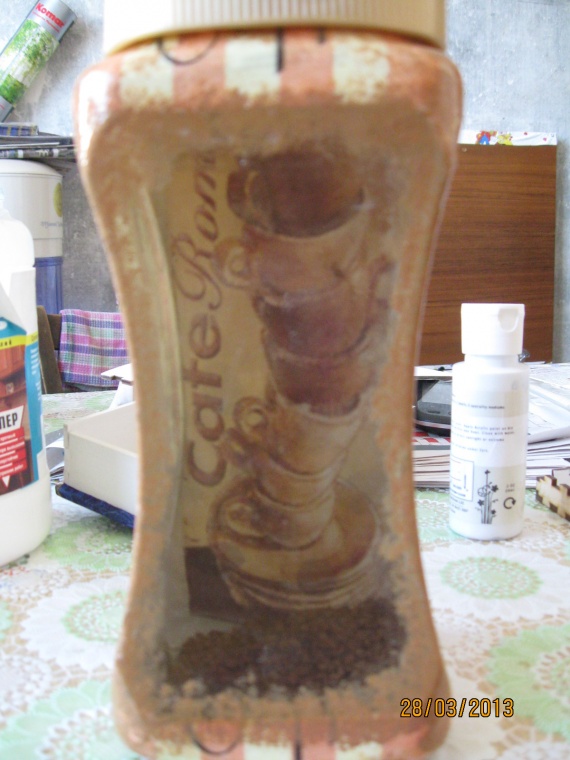 банка кофейная… любимая))… дома… пользуемся(это «окошко»-а там, внутри,«грязные чашки»), салфетки, лак, эмаль(почпоканы бока) и декупажная карта(чашки «внутри»))