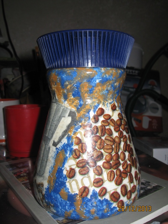 банка для кофе-для подруги захотелось сделать просто приятное. ну и под цвет крышечки что-то сварганить… две салфетки здесь… такая(вверху)… и… такая(внизу)… очень неудобная в работе баночка… зато интереснее!)