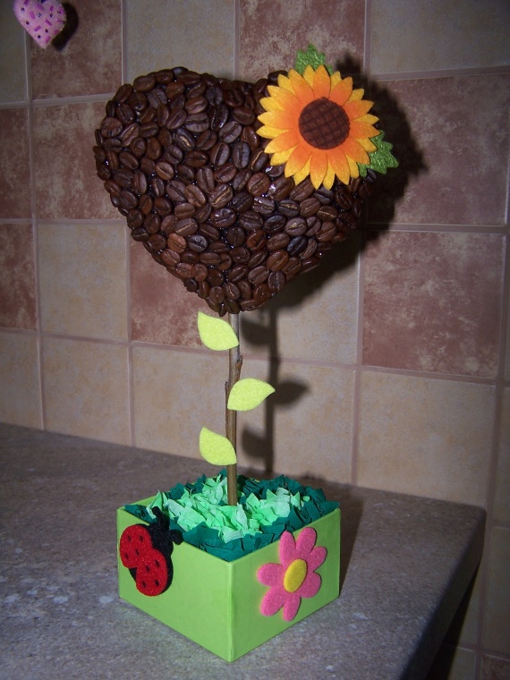 Как-то я уже размещала свои топиарии, выполненные методом торцевания. И вот, наконец-то, осуществила давнее желание: сделать топиарий из кофейных зерен. Вот и получилось у меня такое вот сердечное или любовное деревце, которое подарила супругу на день влюбленных. Он сразу и не понял, что я это сделала сама. Думал, что купила :)
