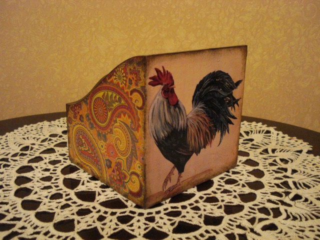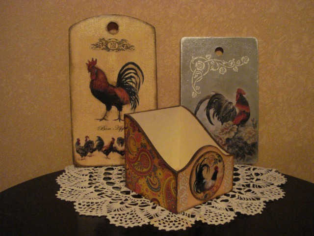 Может, уже и надоели петухи, но как-то к месту они приходятся в декупаже. Особенно новогоднем. Доски, короб для специй и чайный домик- вживление картинок, салфетки,трафареты, где-то кракелюр.