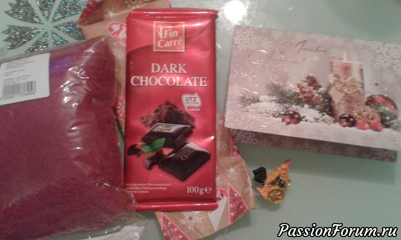 а вчера я получила на почте большой конверт от Аушры из Литвы (https://www.passionforum.ru/users/1006). в конверте волшебный шар на ёлку ручной работы Аушры, вкусный шоколад, петушок-магнит, отличная шерсть для валяния (хомяк ликует!) и душевное поздравление на красивой открытке. спасибо тебе, дорогая Аушра! твои послания всегда радуют и удивляют меня!