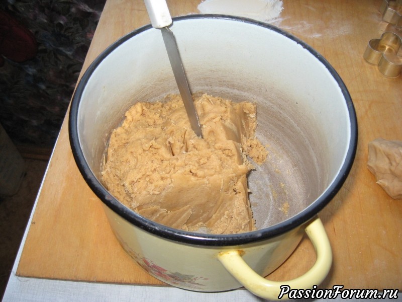С трудом замешала тесто: под конец не проворачивалось даже самой мощной ложкой, в общем, тот еще фитнесс с тренажером в виде кастрюли. Отправила кастрюлю в холодильник до следующего дня.