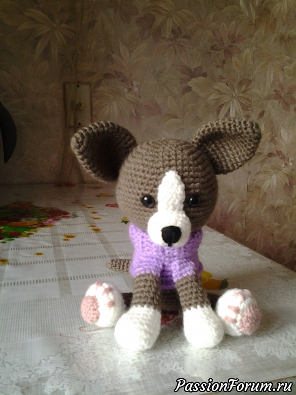 Высота игрушки чуть меньше 15 см.Связан из акриловой пряжи "Детская новинка", наполнитель синтепон, глазки безопасные на винтах.Очень хочется сделать кого-то счастливым, заимев такого друга.