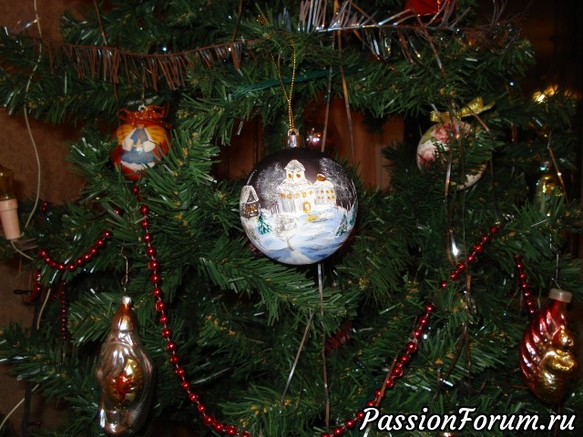 Спасибо Наталье(Наталье) за топик "Расписные шары". Так захотелось сделать что-то похожее. В дело пошли шары, приготовленные для декупажа. Расписывала акриловыми красками., а блестки - обыкновенный лак для ногтей с блестками. Не судите строго , это был полет души!!!